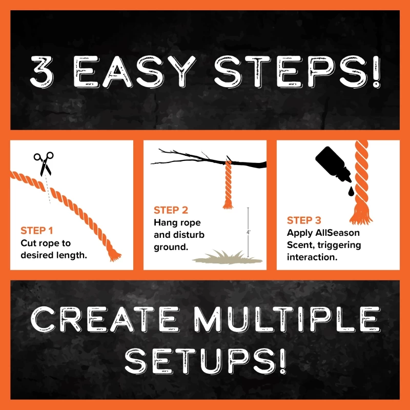 - The HempScent Rope System can be used as a single setup or customized to create multiple setup locations. If you want to get multiple setups, simply cut the rope to the desired length, and hang with paracord or other small rope. The end of your rope should hang around 3.5' feet off the ground for best results. Apply AllSeason Scent liberally to stimulate physical interaction, which begins the scent marking process. Don't be afraid to experiment and get creative with your mock scrape setups.