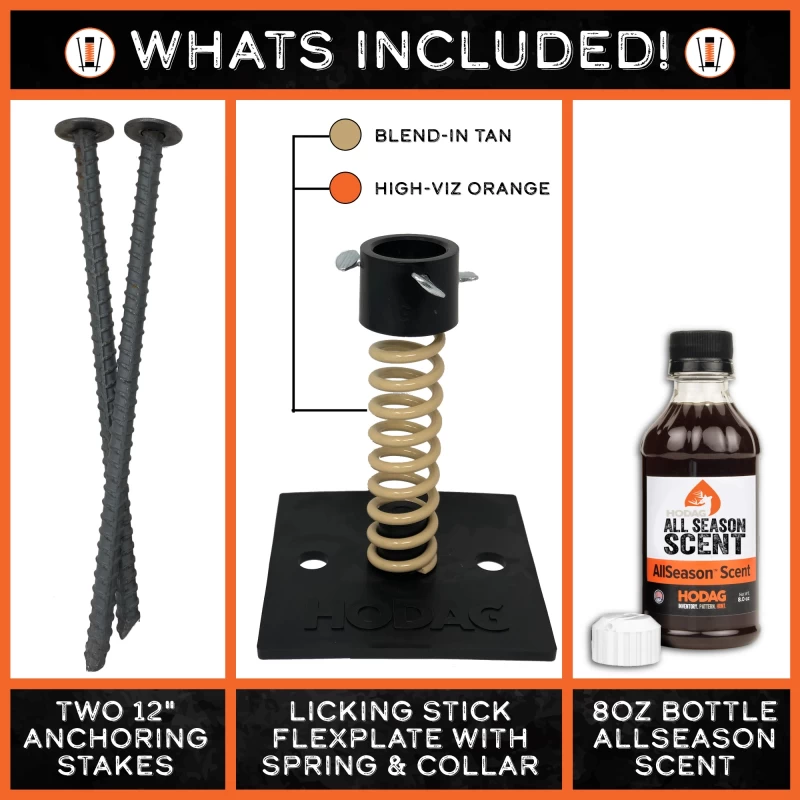 • With our patented spring technology and included rebar stakes the HODAG Licking Stick System will handle the abuse of even the most aggressive whitetail bucks.