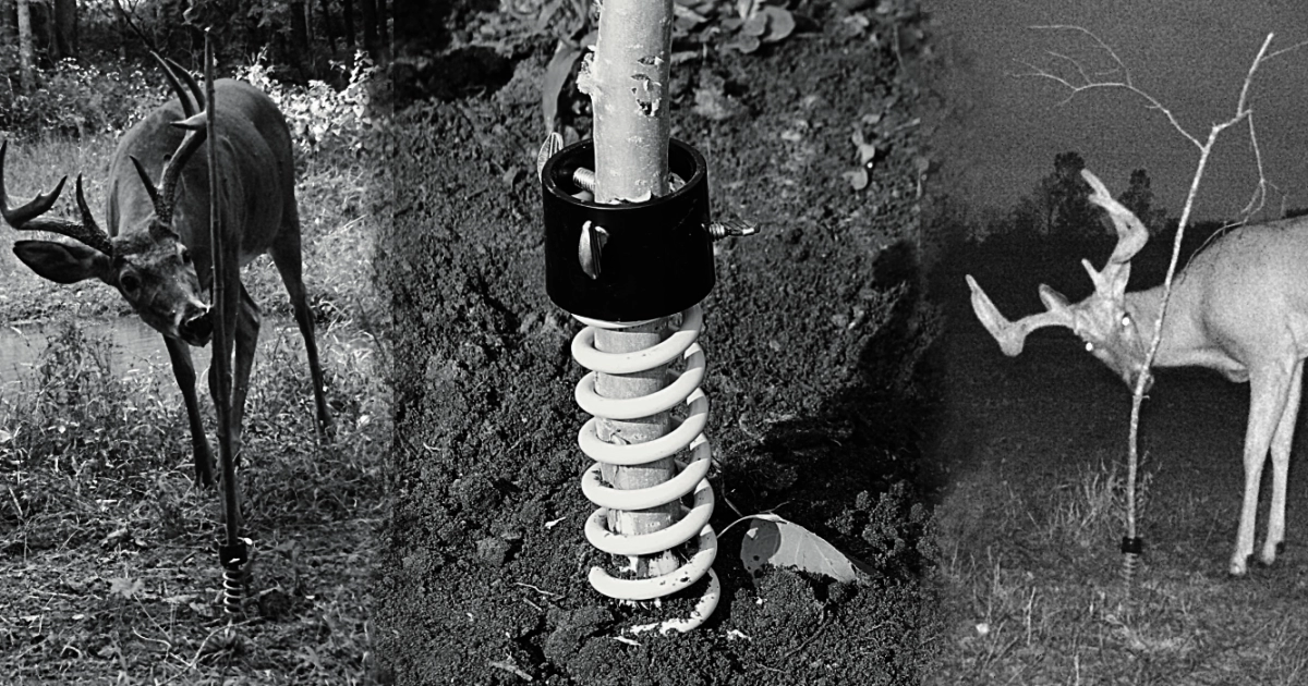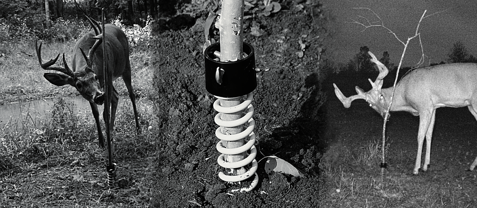 Pick out a sapling/branch that is smaller than the inside diameter of the spring. We have seen the best results with sticks that are 4-5 feet tall. Experiment with different types of trees in your area to see what gets the most interaction from deer. Cut your sapling/branch and insert into the top of the spring. Use the 3 thumbscrews to tighten your branch to the base. Remember, you are simulating and activating a licking stick, not a Rub Post or Scrape Tree. Bigger is not better when it comes to a licking stick found in the wild. If the spring on your licking stick is bending it is because your stick needs to be trimmed down more.